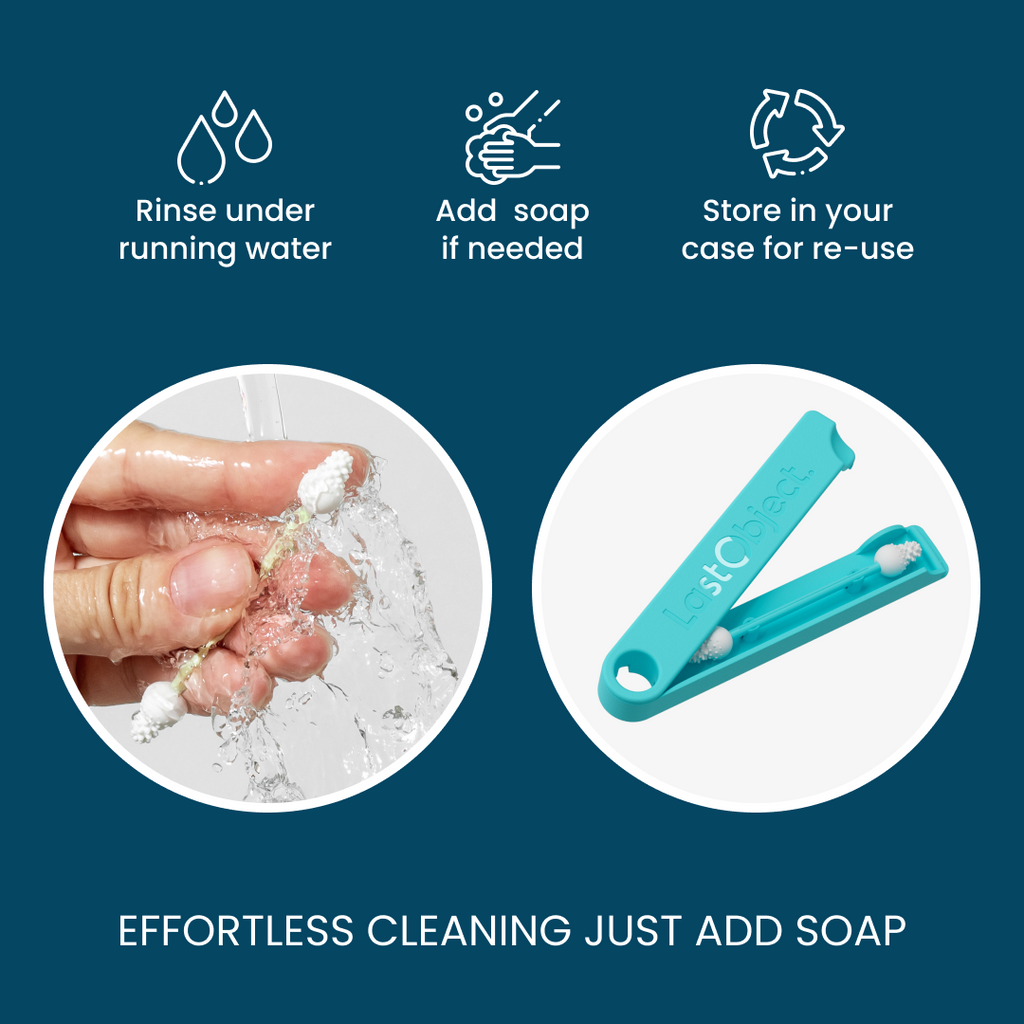 Il tuo LastSwab sostituirà circa 1000 bastoncini monouso. Per farlo durare secondo le aspettative, assicurati di pulirlo gentilmente dopo ogni uso. Usa le punte delle tue dita e strofina le punte gentilmente con sapone e acqua per pulirle. Conservale sempre nella custodia e tienile lontane dal calore. Pulisci la custodia con un disinfettante per le mani e mai nella lavastoviglie.